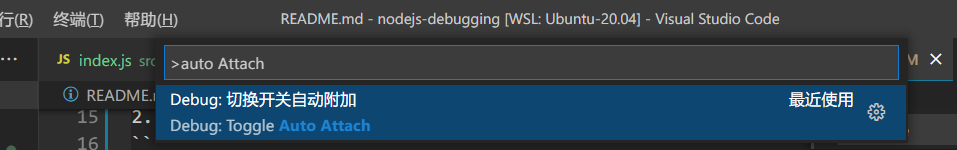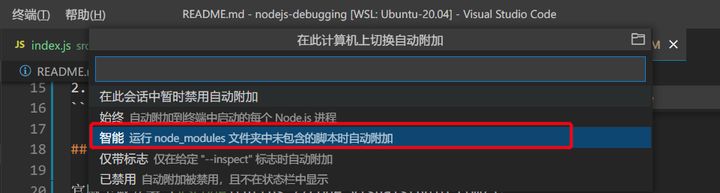首先确保你的 VSCode 是支持debuuger能力的,最好升级一下最新的。这里推荐使用无需配置的 auto-attach 功能,打开VSCode,按 ctrl + shift + p,打开输入 > auto attach。默认是智能(smart)。如果不是,可以查看设置成智能,或者根据场景自行设置成其他的。