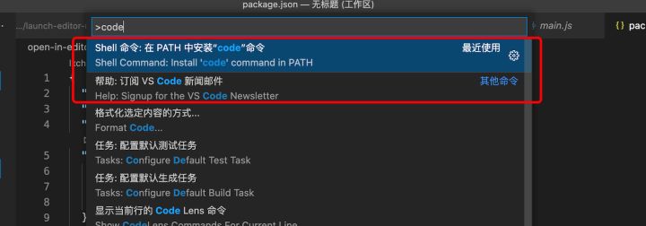 mac 电脑在 VSCode command + shift + p,Windows 则是 ctrl + shift + p。然后输入shell,选择安装code。如下图所示: