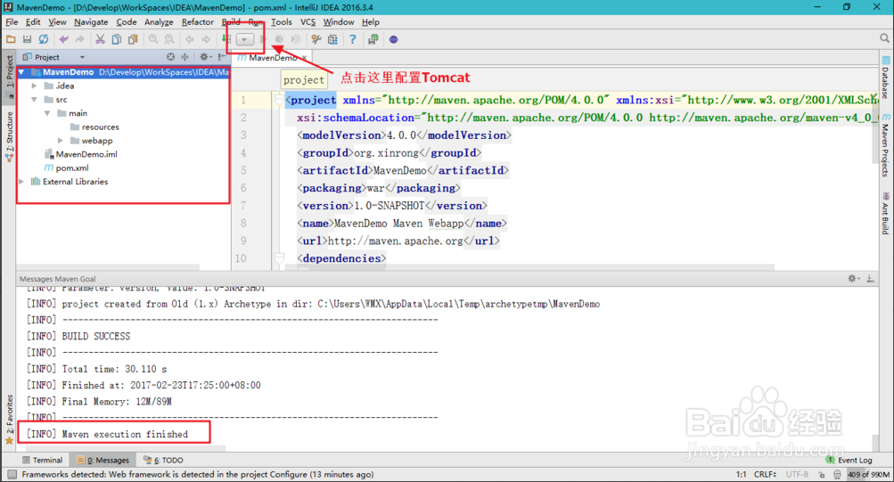项目创建完了还不一定能运行,要看有没有配置好tomcat和jdk了。 具体见步骤二。