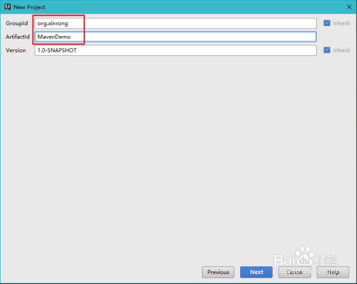 3. 如下图,接下来就是填写groupId 和archetypeId 了,点击next。