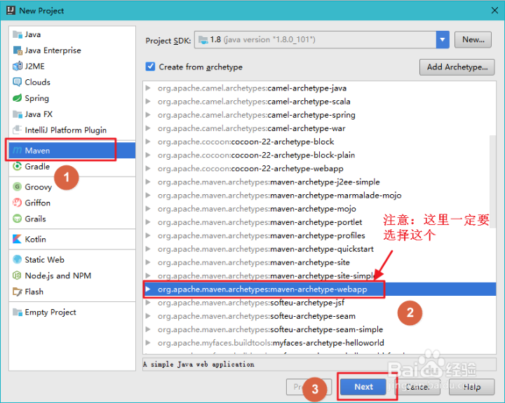 2.如下图,在弹出的new project 页面,选择maven -> 勾选Create from artifactype -> 选中webapp(注意:这个地方有两个app,选择maven-archetype-webapp), next