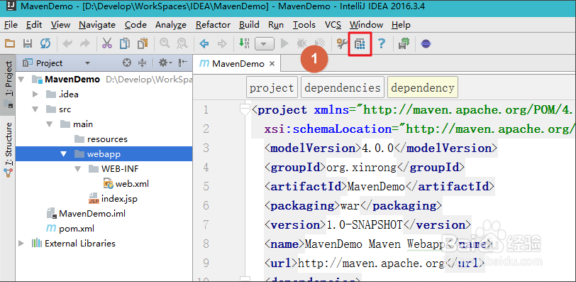 2. 在主页面打开ProjectStructure,点击图示的按钮或是按ctrl+shift+alt+s快捷键