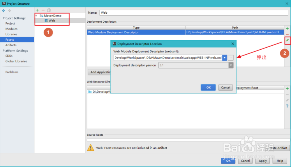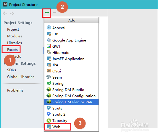 2. 打开ProjectStructure后,按照图示依次点击Facets->+号,在弹出的对话框个中选择Web.