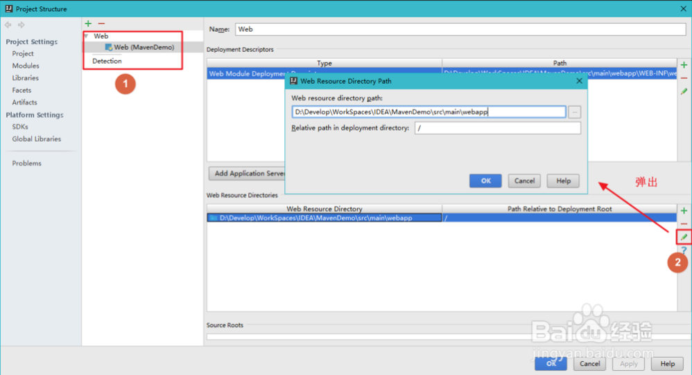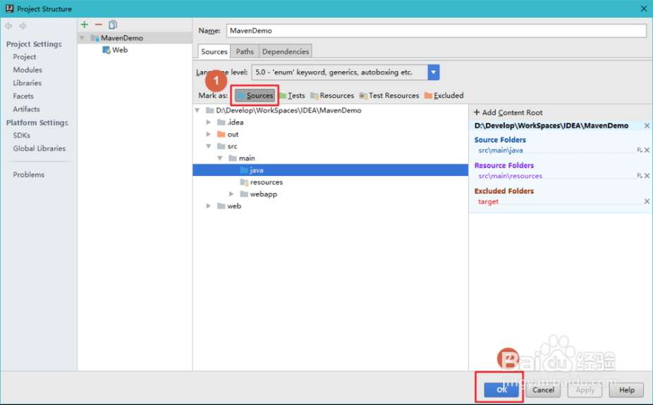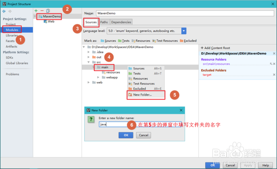 3. 在弹出的Project Structure窗口中,依次从左侧选择Modules->MavenDemo->Sources,打开项目的main目录,在main上单击右键选择New Folder,在弹出的对话框中填写文件的名字后,点击Ok。