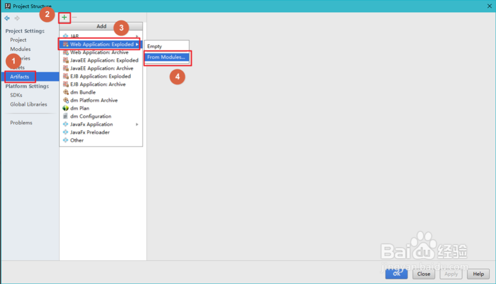 6. 再次回到Project Structure,点击左侧 Artifacts,依次点击+号->Web Application:Exploded->From Modules.
