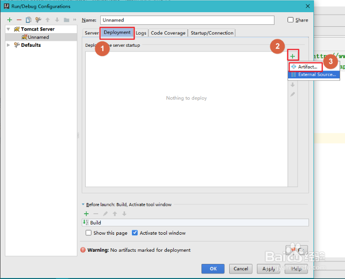 11. 在弹出的对话框中,选择Deployment,点击右侧的+号,选择Artifact。