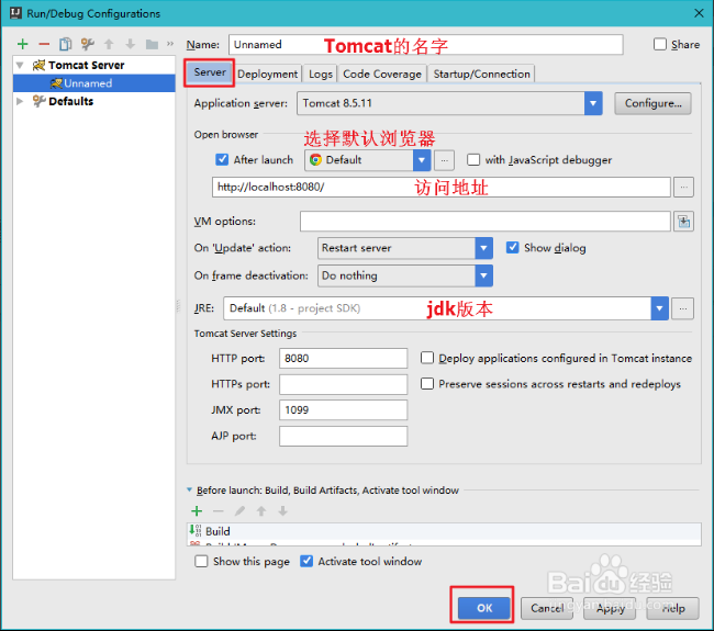 12. 接着回到Server选项卡,配置一下Tomcat的基本参数,最后点击Ok即可