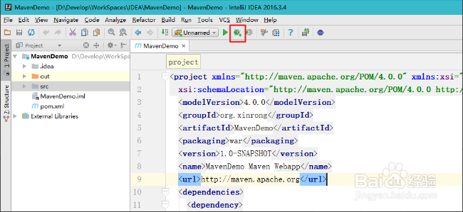13. 最后点击工具栏上的小虫子按钮,以Debug方式启动Tomcat服务器。