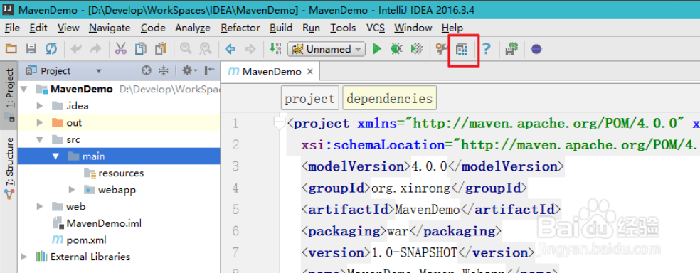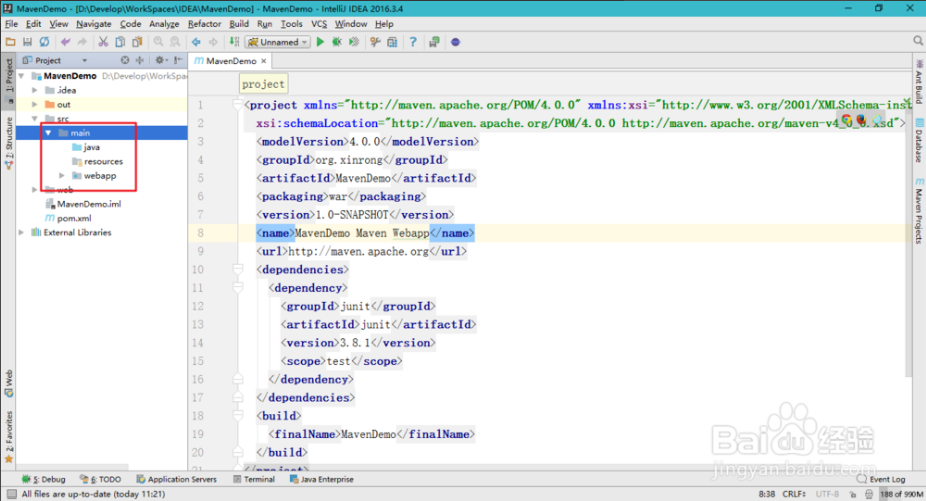 1. 创建及部署完Maven项目会发现,main目录下没有java源文件夹。接下来我会教大家怎么创建这个java源文件夹。