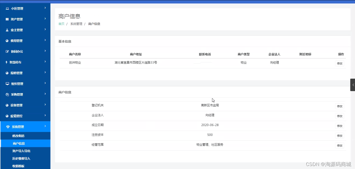 系统管理:权限组、员工权限、小区配置、流程管理、修改密码、商户信息、小程序配置、短信配置、位置信息、资产导入、公众号对接、打印配置、历史缴费导入