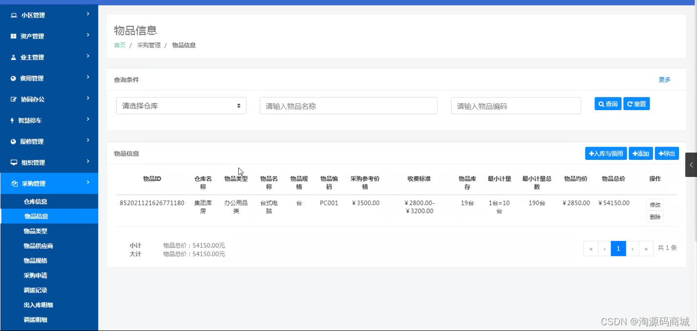 采购管理:仓库信息、物品信息、物品类型、物品供应商、物品规格、采购申请、物品使用记录、调拨明细、物品领用、我的物品、转增记录、调拨记录、出入库明细