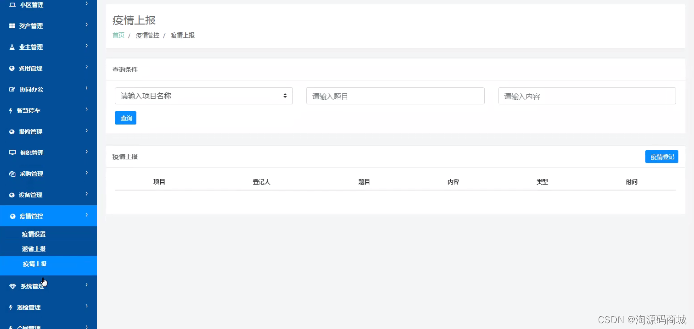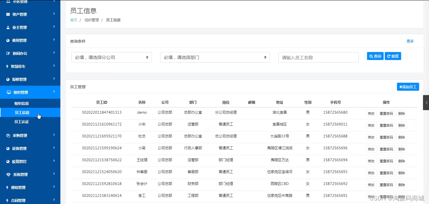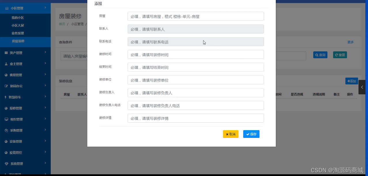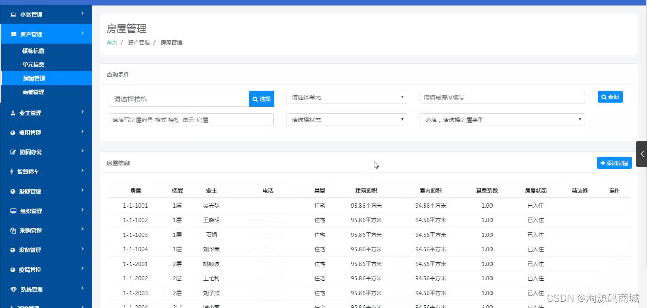 资产管理:楼栋信息、单元信息、房屋信息、商铺信息