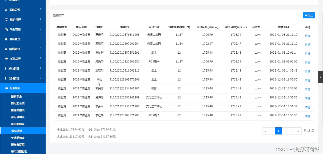 报表统计:报表专家、费用汇总表、楼栋费用表、费用分项表、费用明细表、缴费清单、欠费明细表、预缴费提醒、费用到期提醒、缴费明细表、报修汇总表、未收费房屋、问卷明细表