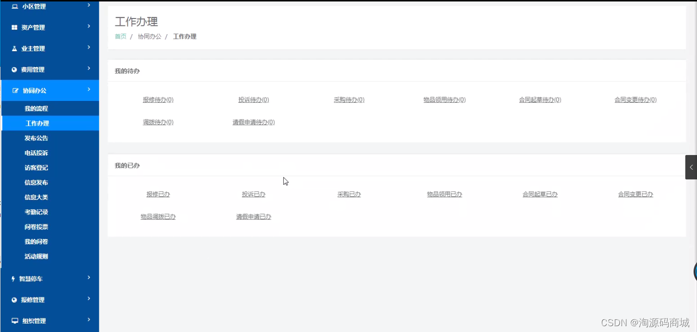 协同办公:流程示例、我的流程、工作办理、发布公告、电话投诉、访客登记、考勤记录、智慧考勤、今日考勤、月考勤、考勤记录、问卷投票、我的问卷、活动规则、信息发布、信息大类