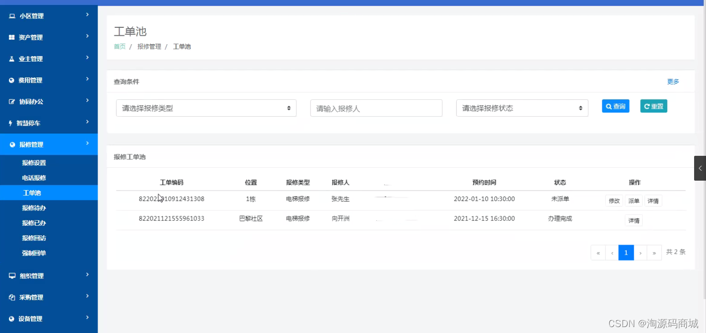报修管理:报修设置、电话报修、工单池、报修待办、报修已办、报修回访、强制回单