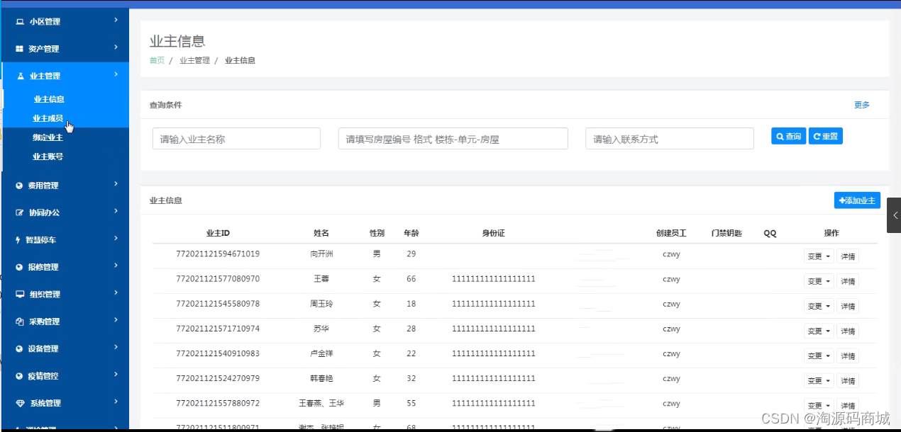 业主管理:业主信息、业主成员、绑定业主、业主账号
