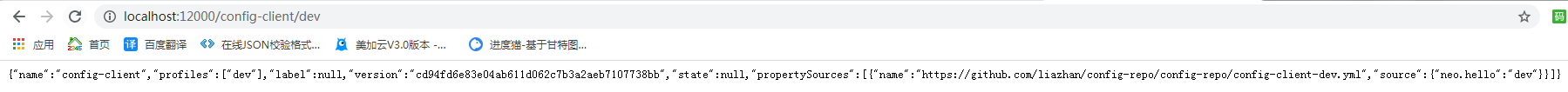首先我们先要测试 Server 端是否可以读取到 github 上面的配置信息,直接访问 http://localhost:12000/config-client/dev 返回信息如下: