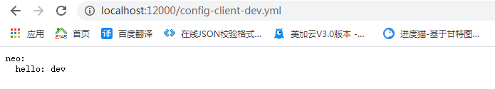 如果直接查看配置文件中的配置信息可访问 http://localhost:12000/config-client-dev.yml 返回: