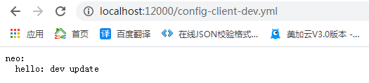 修改配置文件 config-client-dev.yml 中配置信息为:dev update, 再次在浏览器访问 http://localhost:12000/config-client-dev.yml 返回:dev update,说明 Server 端会自动读取最新提交的内容。