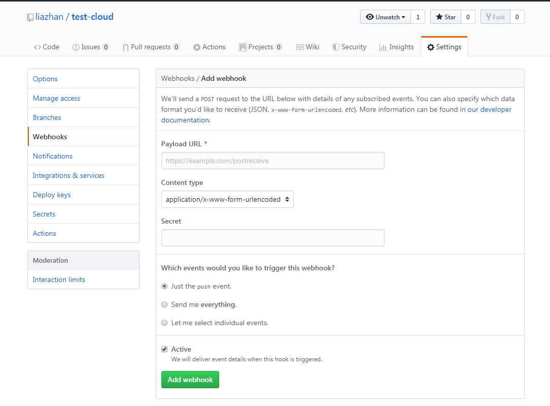 Payload URL:触发后回调的 URLContent type:数据格式,两种一般使用 jsonSecret:用作给 POST 的 body 加密的字符串。采用 HMAC 算法events:触发的事件列表。