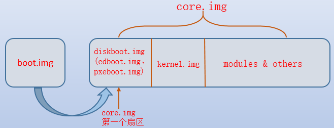 core.img中包含了多个img文件的内容,包括diskboot.img/kernel.img等。