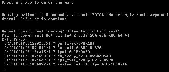 如果没有指定root=的选项,将报错“no or empty root …… dracut…kernel panic”的错误。如下图。