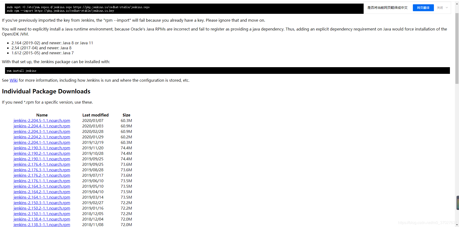 1、下载 https://pkg.jenkins.io/redhat-stable/ 下载合适的版本,下载完以后通过rz -y命令将安装包上传到服务器中(centos7)。