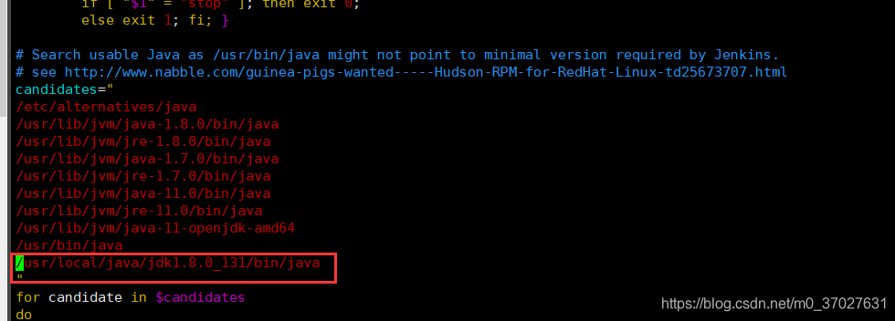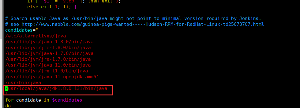 编辑/etc/init.d/jenkins文件,添加下图中红框中内容其中/usr/local/java/jdk1.8.0_131为jdk安装路径,后面再加上/bin/java
