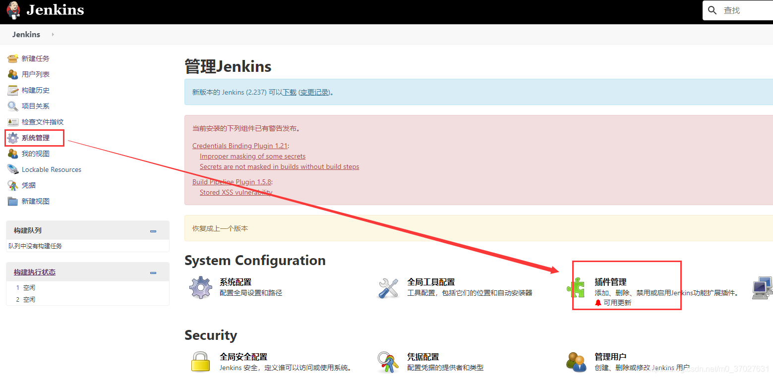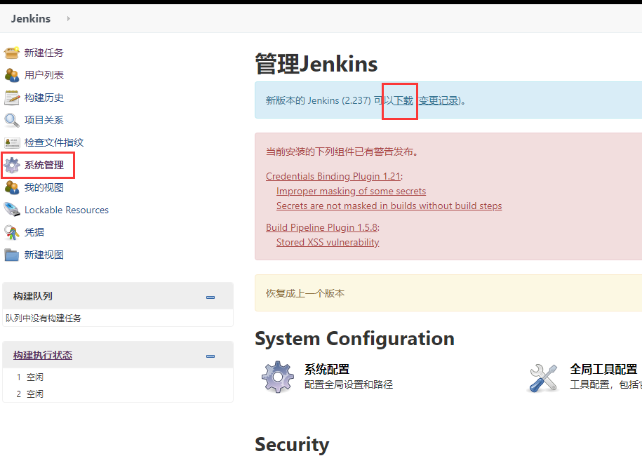如下图,系统管理—>下载。将jenkin.war包下载之后替换掉安装时/usr/lib/jenkins/jenkins.war路径下的war然后重启就可以,也可以从Jenkins的官网下载war包进行替换