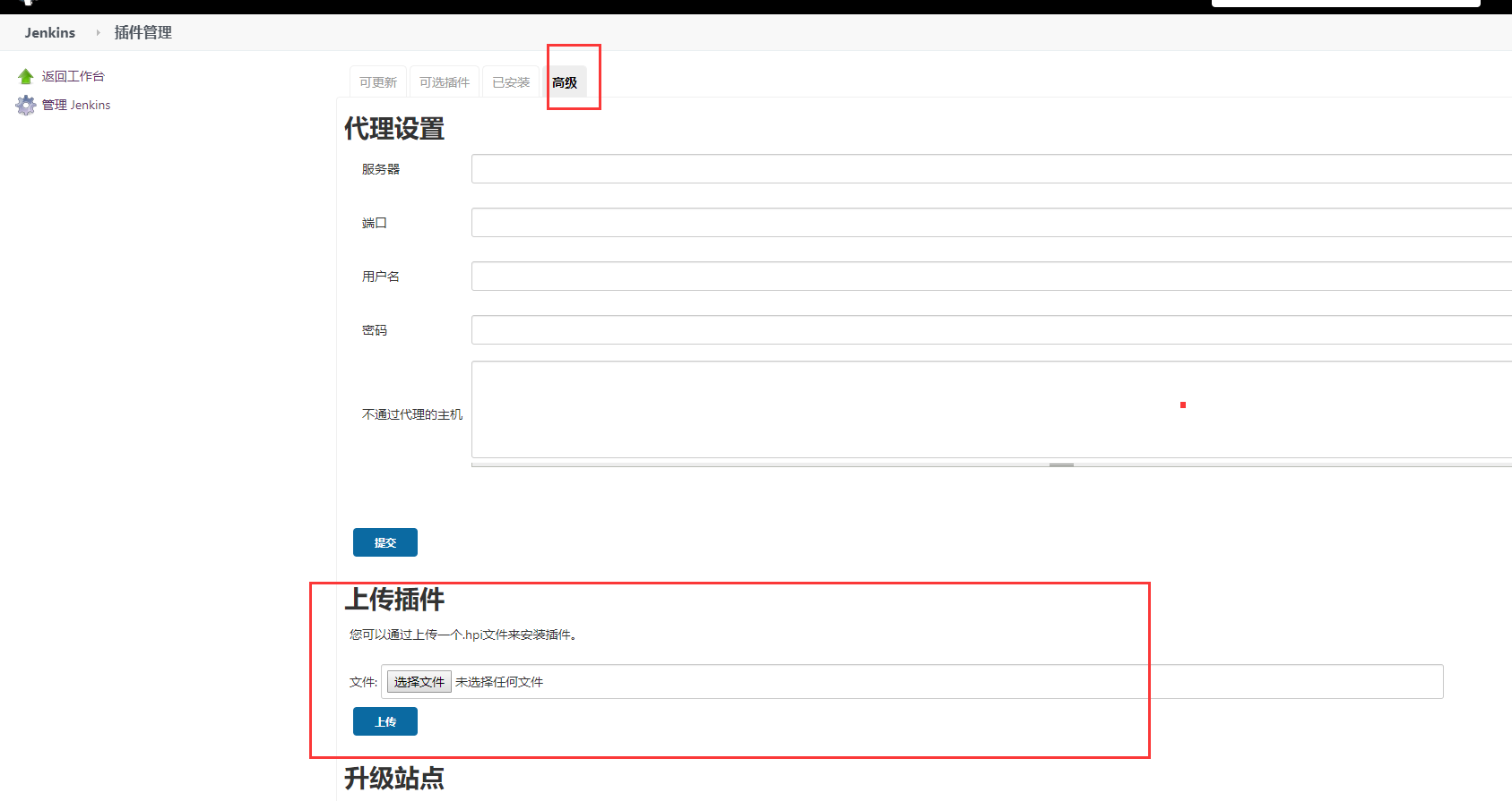 (2)、通过离线下载地址找到需要的插件,下载到本地,然后打开:系统管理—> 插件管理—>高级—>上传插件,选择本地下载好的插件点击上传,上传完重启Jenkins