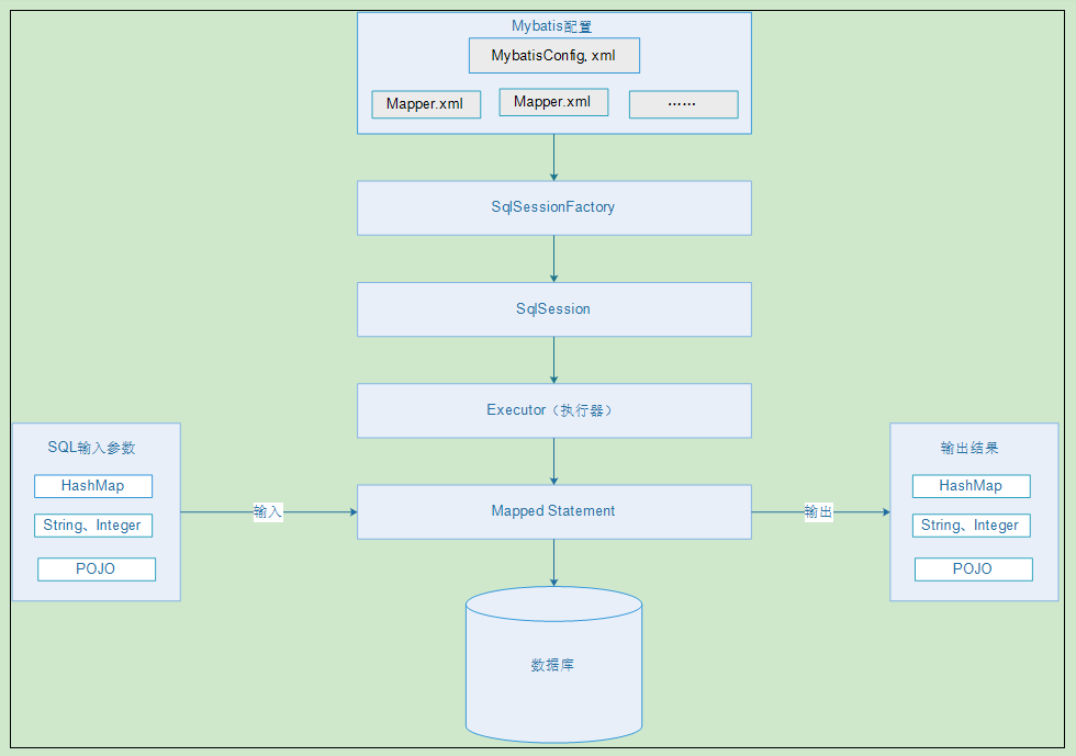 6)Mapped Statement对sql执行输入参数进行定义,包括HashMap、基本类型、pojo,Executor通过Mapped Statement在执行 sql前将输入的java对象映射至sql中,输入参数映射就是jdbc编程中对preparedStatement设置参数。