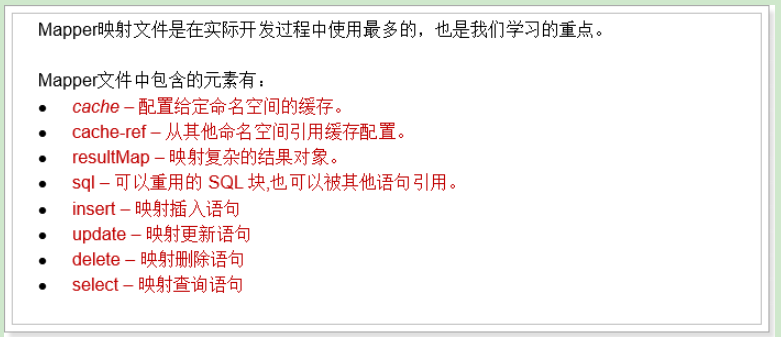 5)Mapped Statement也是mybatis一个底层封装对象,它包装了mybatis配置信息及sql映射信息等。mapper.xml文件中一个sql 对应一个Mapped Statement对象,sql的id即是Mapped statement的id。