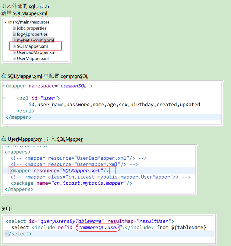 外部的sql片段,除了指单独写的存储sql的片段的mapper,还有别的实体类的mapper文件。