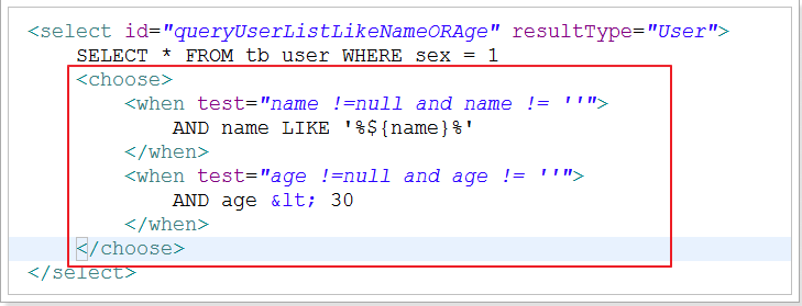 <select id="queryUserByWhere1" parameterType="com.dayee.entity.User" resultType="com.dayee.entity.User">