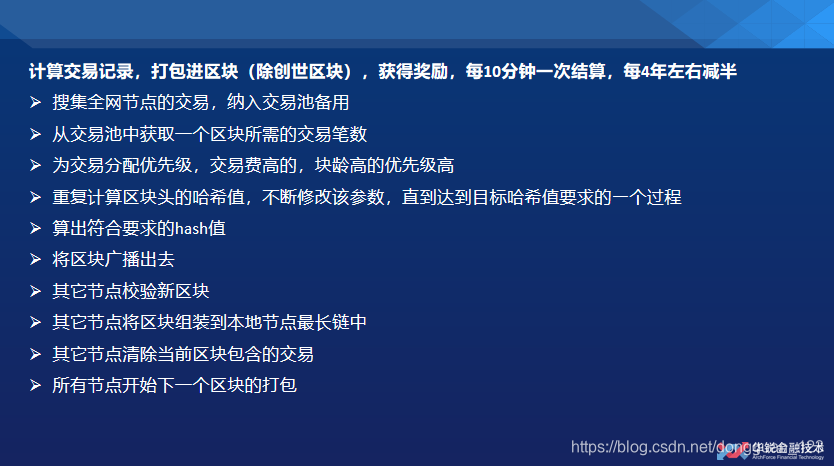 注:工作量证明POW,给定一个难度系数(hash目标值),一般是给一个256位的二进制数,比如前面60位都是0作为目标值。以上一个区块的hash(这个hash是用上一个区块的头部,包括版本号、上上一块区块的hash、Merkle根hash值、时间戳等根据规定方法融合在一起进行hash算法得出的hash值)为入参之一,再加上一个随机数,暴力尝试修改这个随机数,相当于不停修改入参,得到符合目标hash值(小于目标hash值即可)的随机值,即得到系统的承认,并且获得系统的奖励6个左右比特币(当前时间节点),这6个系统奖励就是无中生有创造出来的,即发行比特币的过程。系统奖励的币无需校验上输入,即上一个给你币的人。然后用这个随机数和上一区块的hash值融合起来,进行一次hash运算,得到的hash值就是下一个区块暴力破解难题的hash入参,如此循环下去,不停挖矿。