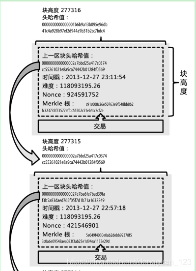 注:区块链就是一本追踪比特币所有权和流向的账本,每一页账本就是一个区块,一个区块能记录大概4000条左右的交易记录。每一个区块头部的信息会作为下一个区块计算hash值函数的入参数之一,所以每个区块就都相互关联起来了,形成区块链。