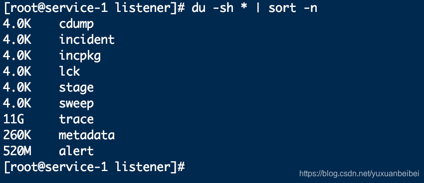 由于服务器是2016年开通的百度云服务器,目前已经无法扩充磁盘空间,经过排查发现数据库目录占用了大量磁盘空间。逐个目录排查,发现目录($ORACLE_BASE/diag/tnslsnr/服务器用户名/listener)下占用了33G,