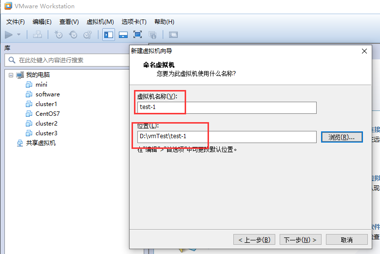 5.给虚拟机起一个名字并选择虚拟机的安装位置。这个名字就是下图中VMware的左边展示的名字,这个名字不重要,只是便于我们管理。