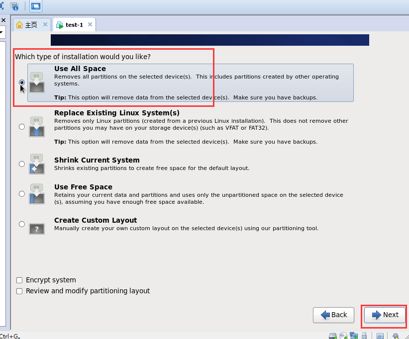 22、选安装方式:使用use all space。也就是所有的磁盘都用来安装系统