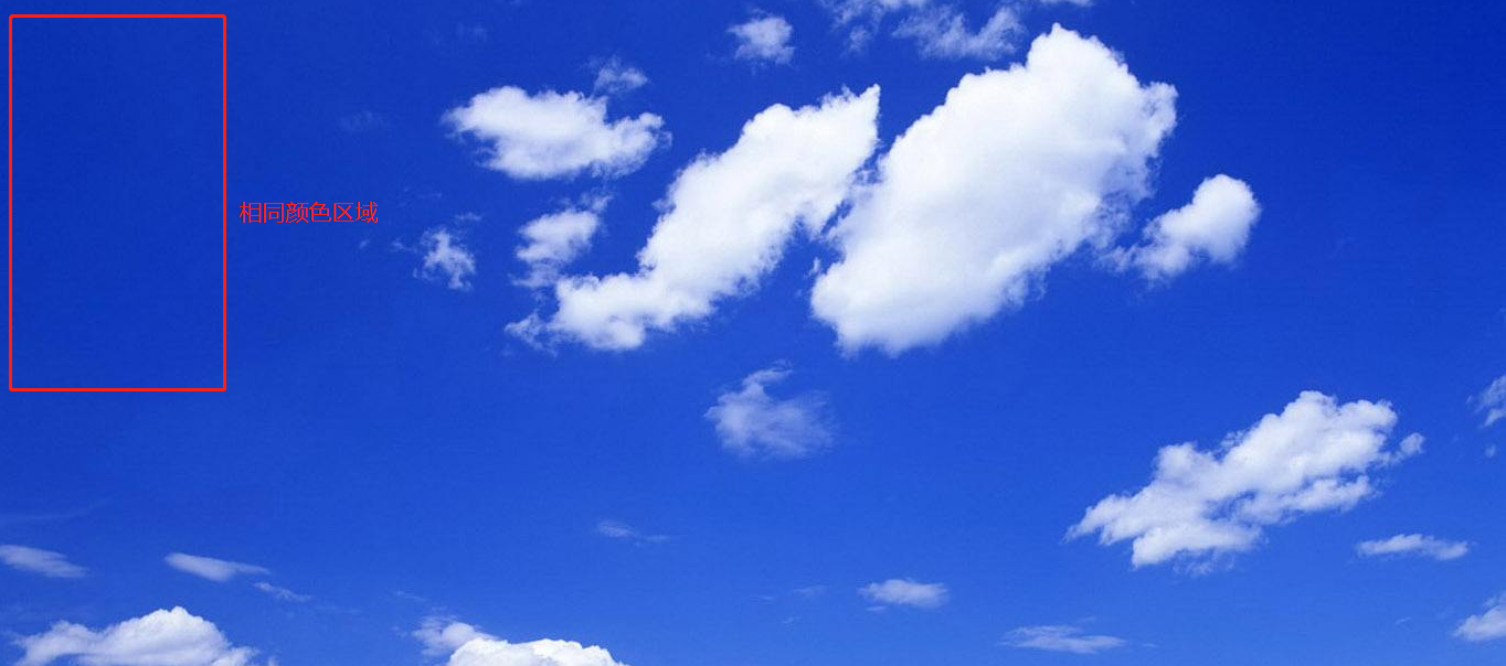 例如红框内的区域,我们可以把它看成由很多相同蓝色像素拼接而成,压缩保存图片时我们只需要记录蓝色和区域信息。