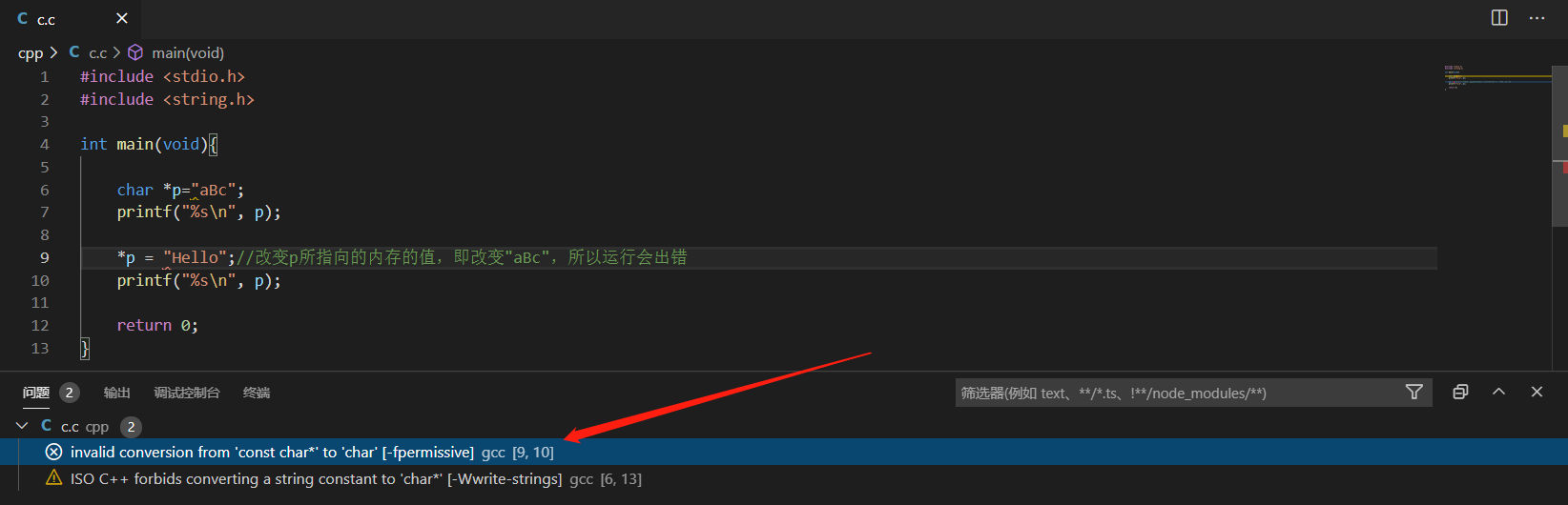 char *p="aBc";该段代码编译虽然可以通过(会有警告),但在VScode会发出ISO C ++禁止从字符串常量转换为char *警告,之所以编译能通过这是因为字符串常量位于只读存储区却不允许写操作。验证如下: