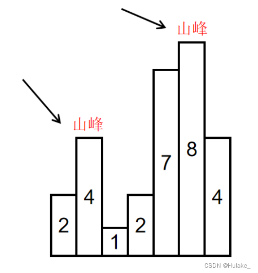 如输入[2,4,1,2,7,8,4]时,会形成两个山峰,一个是索引为1,峰值为4的山峰,另一个是索引为5,峰值为8的山峰,如下图所示: