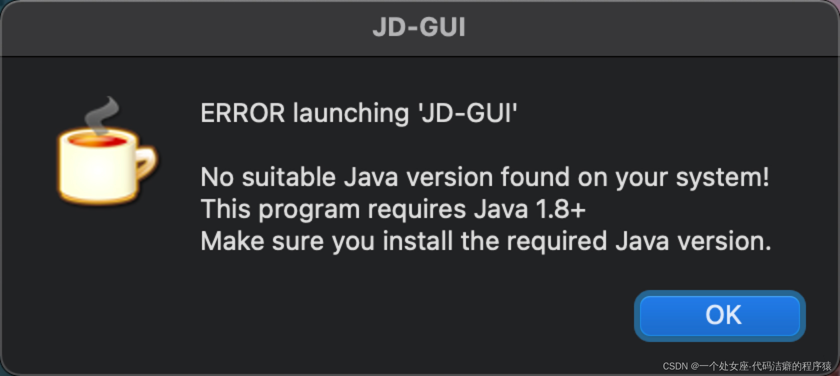 根据提示信息,是该反编译软件要求JDK版本号是 1.8以上,检查自己安装的版本号。