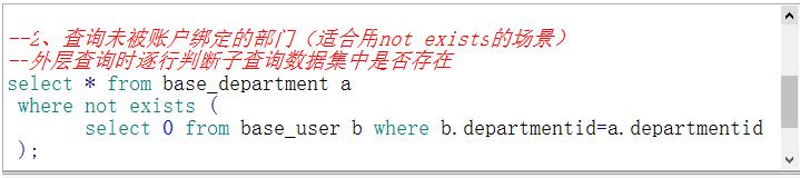 仅从语法上来讲,在大多数情况下exists与in及not exists与not in可相互转换使用,但其各自的适用场景略有不同,执行效率也有差异。当子查询数据量较小时应使用in或not in,反之则使用exists或not exist比较合适,因为使用in时,Oracle查询是执行顺序是由内而外的,但如果使用exist的话Oracle则会“先外后内”,查询开销相对较大,现举例如下: 查询所有绑定了部门ID的用户(适合用in的场景) ![]() 适合用in的场景 查询未被账户绑定的部门(适合用not exists的场景) ![]() | |