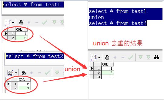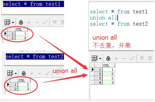 union,查询返回多表去重后的结果集: ![]() union,查询结果去重 union all,查询返回多表未重的结果集: ![]() union all并集查询,不去重 | |