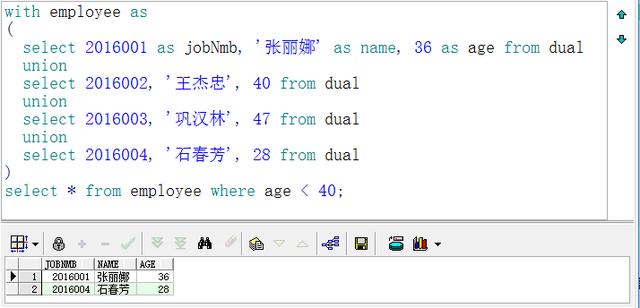 当在sql查询时需要对有规律的一批数据进行分析处理而又不想将这批数据存入实体表时,我们可以使用with关键字临时构建一个虚拟的数据集,以便对其进行与实体表相似的sql操作,如: ![]() (注:with关键字构造的虚拟数据集临时存放于用户的临时表空间中) | |