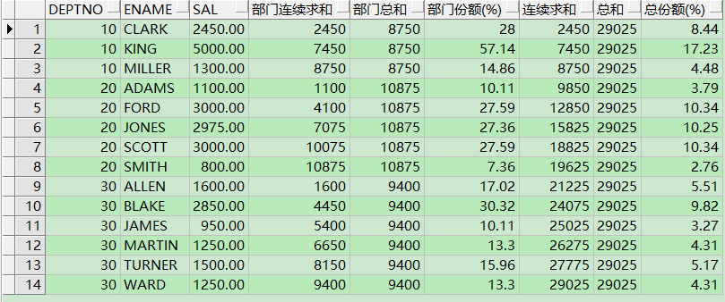 select deptno, ename, sal, sum (sal) over(partition by deptno order by ename) 部门连续求和, --各部门的薪水 "连续" 求和 sum (sal) over(partition by deptno) 部门总和, -- 部门统计的总和,同一部门总和不变 100 * round(sal / sum (sal) over(partition by deptno), 4 ) "部门份额(%)" , sum (sal) over( order by deptno, ename) 连续求和, --所有部门的薪水 "连续" 求和 sum (sal) over() 总和, -- 此处 sum (sal) over () 等同于 sum (sal),所有员工的薪水总和 100 * round(sal / sum (sal) over(), 4 ) "总份额(%)" from emp ![]() 1. group by是分组函数,partition by是分析函数(然后像sum()等是聚合函数); 2. 在执行顺序上, 以下是常用sql关键字的优先级 from > where > group by > having > order by 而partition by应用在以上关键字之后,实际上就是在执行完select之后,在所得结果集之上进行partition。 3. partition by相比较于group by,能够在保留全部数据的基础上,只对其中某些字段做分组排序(类似excel中的操作),而group by则只保留参与分组的字段和聚合函数的结果(类似excel中的pivot)。 | |