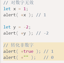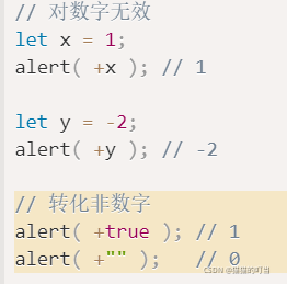 - 一元运算符加号 ‘+’ 应用于单个值,对数字没有任何作用,但是如果运算元不是数字,加号 ‘+’会将其转化为数字。