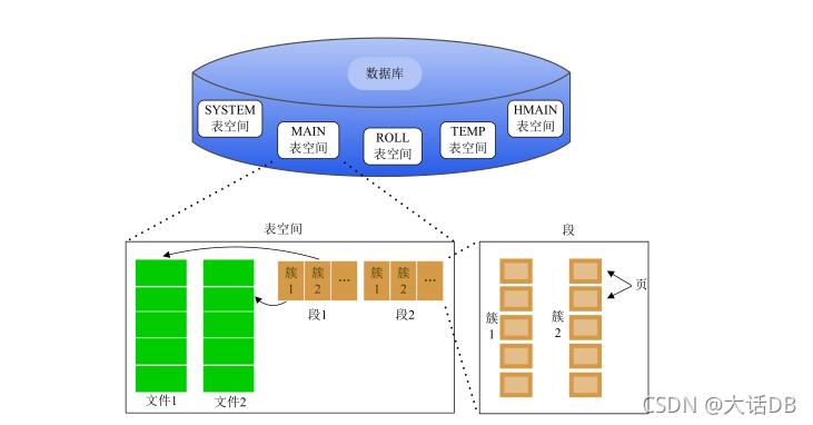 DM 数据库为数据库中的所有对象分配逻辑空间,并存放在数据文件中。在 DM 数据库内部,所有的数据文件组合在一起被划分到一个或者多个表空间中,所有的数据库内部对象都存放在这些表空间中。同时,表空间被进一步划分为段、簇和页(也称块) 。通过这种细分,可以使得 DM 数据库能够更加高效地控制磁盘空间的利用率。图 1.1 显示了这些数据结构之间的关系。