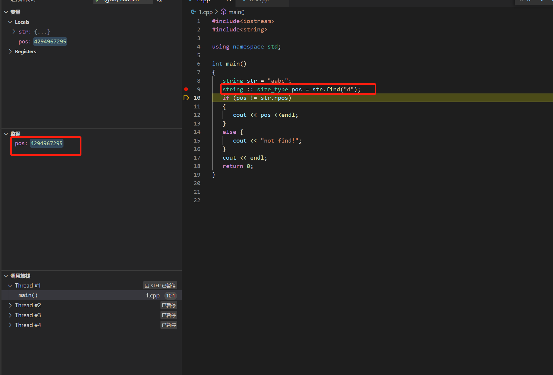 }例子:找不到的情况,调试可以看到npos的值为-1,即是4294967295